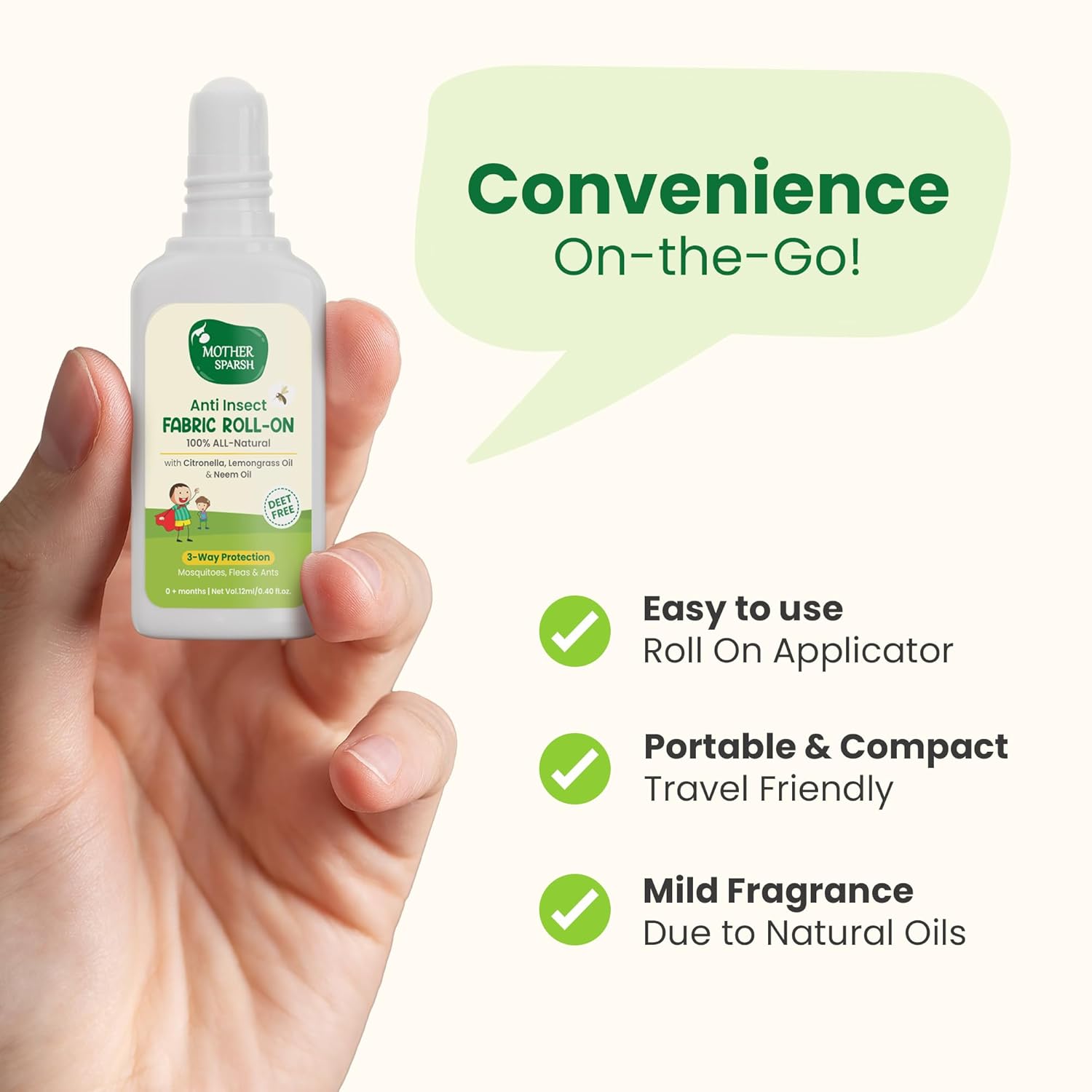 Mother Sparsh Natural Mosquito Repellent Fabric Roll-on for Babies-12ml, DEET Free 3-Way Protection from Mosquitoes, Fleas and Ants