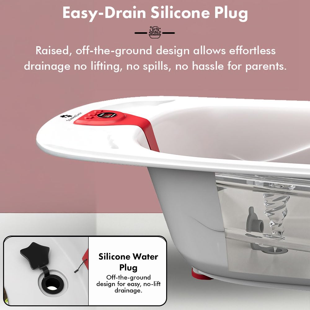 The StarAndDaisy Baby Bath Tub, designed for children from newborn to 5 years, features a built-in temperature sensor to ensure optimal water warmth for your baby's safety. Its anti-slip legs provide stable support during bath time, while the included baby bather offers comfortable positioning without the need for wheels. Crafted for ease of use and enhanced safety, this tub in white and red is ideal for everyday bathing routines.